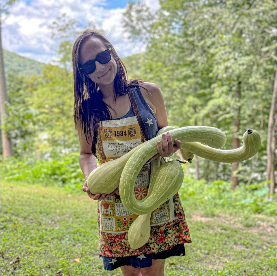Our herbalist pictured with her rampicante. An Italian heirloom squash variety that represents her family's heritage.