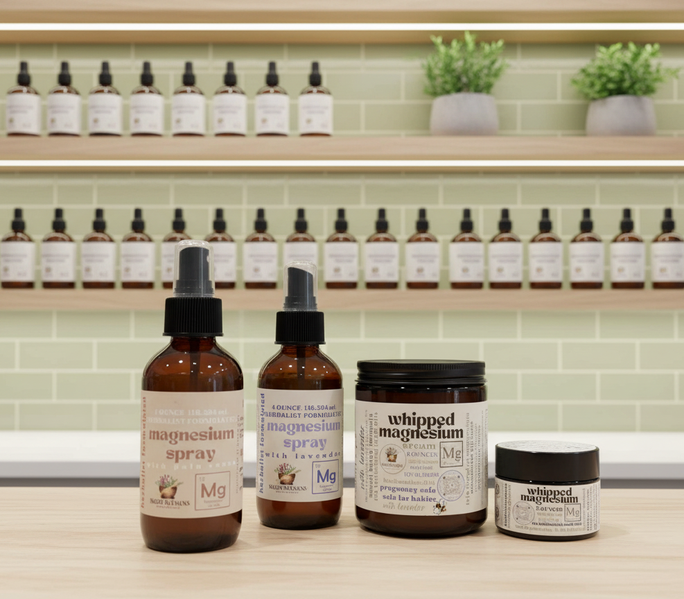 Our magnesium is formulated in house, meaning our herbalist takes raw flakes of zechstein magnesium chloride, magnesium glycinate, magnesium sulfate and blends it with filtered, non fluoridated, spring water.