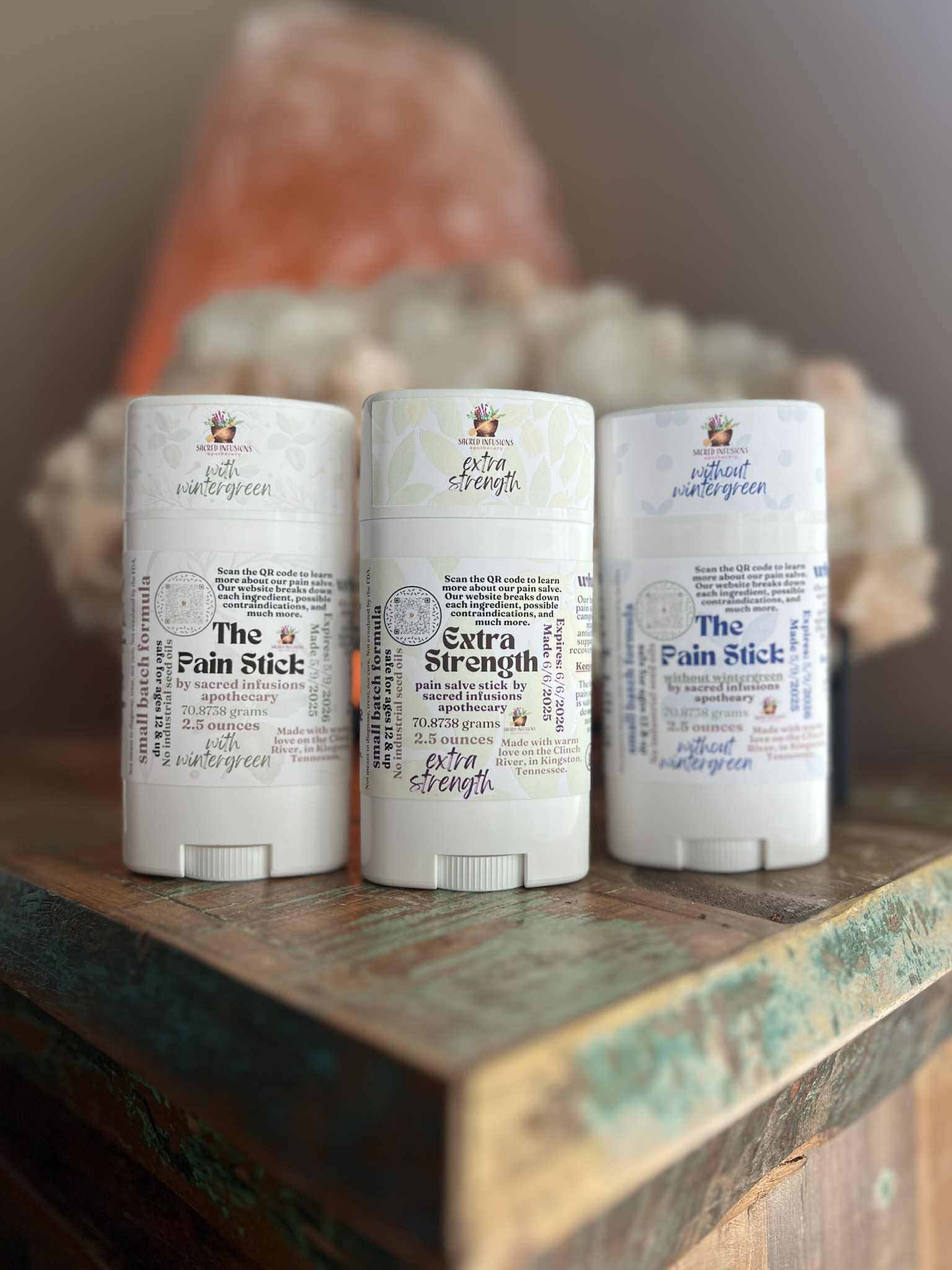 Avocado oil infused with Arnica (Arnica montana), Willowbark (Salix alba), St. Johns Wort (Hypericum perforatum), Comfrey (Symphytum), Magnesium sulfate. Essential oils: Peppermint (Mentha piperita L.), Cinnamon (Cinnamon cassia), Ginger (Zingiber officinale), Black pepper (Piper nigrum), Clove (Eugenia caryophyllus), Laurel leaf (Laurus nobilis), Chamomile (Chamomilla recutita), Juniper (Juniperus communis), Thyme (Thymus vulgaris), Beeswax. Essential oil dilution is 2%.