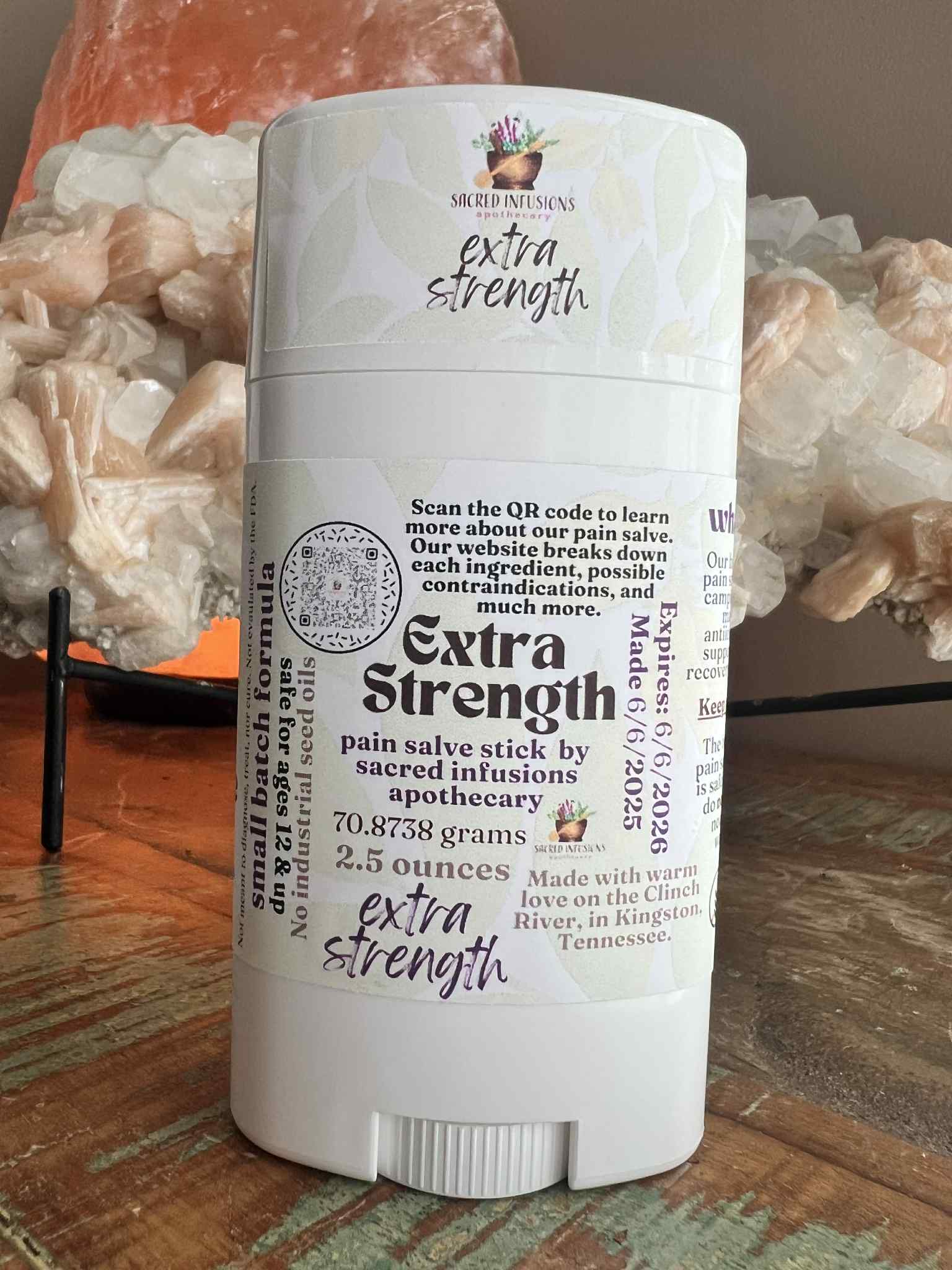 The herbalist formulated our extra strength pain salve with tamanu oil and camphor at 4%. This allows daily use at a higher concentration than our original pain salve.