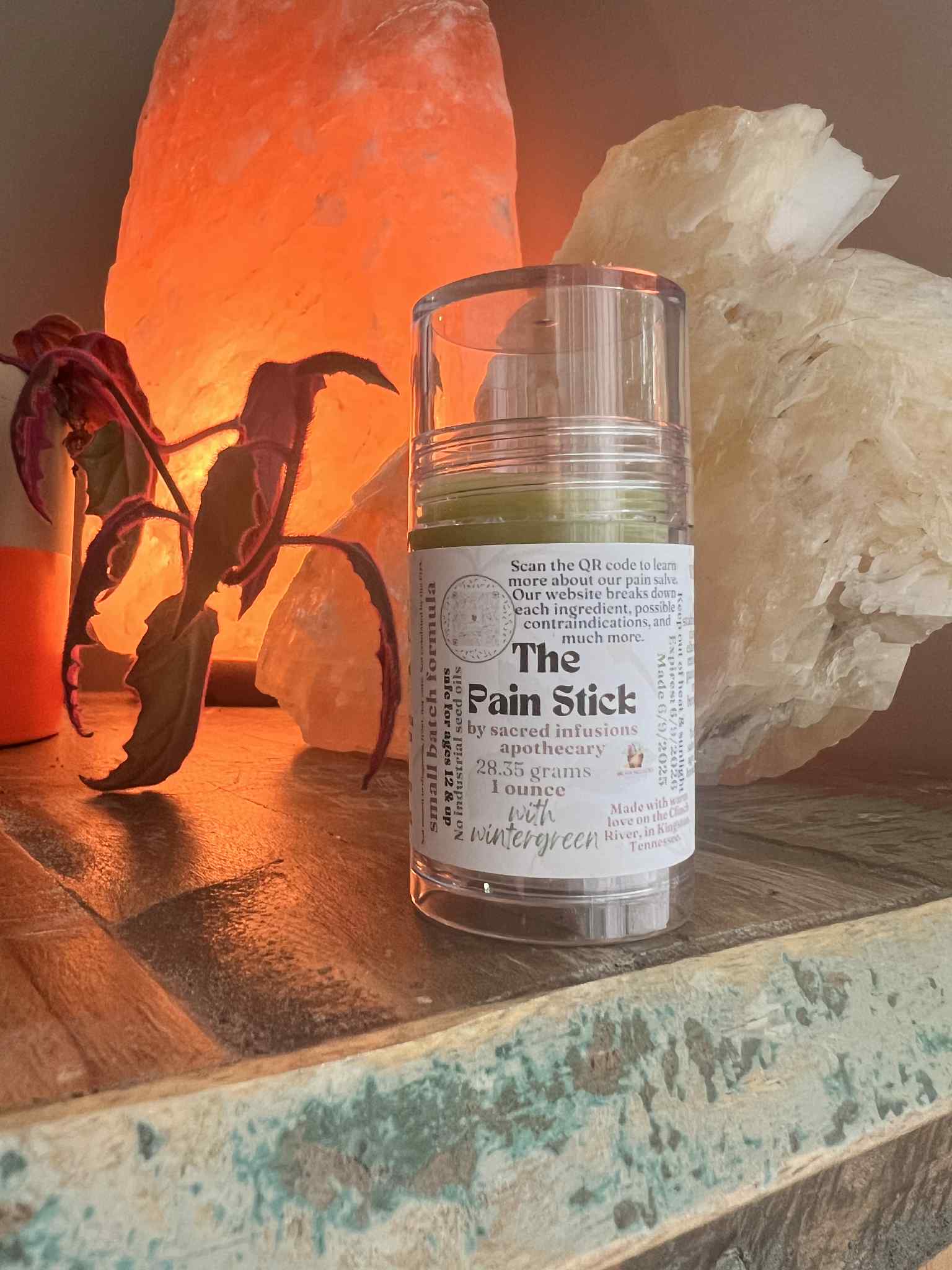 Avocado oil infused with Arnica (Arnica montana), Willowbark (Salix alba), St. Johns Wort (Hypericum perforatum), Comfrey (Symphytum), Magnesium sulfate. Essential oils: Peppermint (Mentha piperita L.), Cinnamon (Cinnamon cassia), Ginger (Zingiber officinale), Black pepper (Piper nigrum), Clove (Eugenia caryophyllus), Laurel leaf (Laurus nobilis), Chamomile (Chamomilla recutita), Juniper (Juniperus communis), Thyme (Thymus vulgaris), Beeswax. Essential oil dilution is 2%.