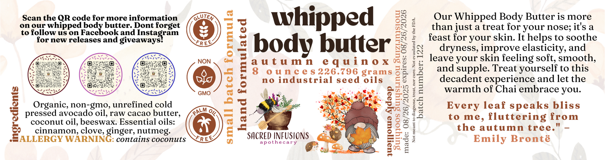 AUTUMN EQUINOX: Organic, non-gmo, unrefined cold pressed avocado oil, raw cacao butter, coconut oil, beeswax, essential oil blend of cinnamon, clove, ginger, cardmom, and vanilla.